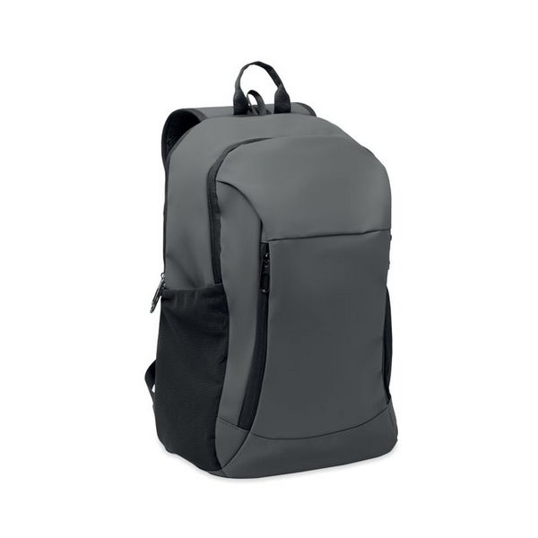 Ruksak za prijenosno računalo od 15 inča od mekog PU materijala s podstavljenim leđima i skrivenim glavnim pretincem s patentnim zatvaračem. 1 prednji džep s patentnim zatvaračem, 2 prednja bočna džepa s patentnim zatvaračem i 2 elastična mrežasta bočna džepa. S podstavom od 210D RPET-a.