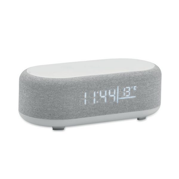 Bežični 4-u-1 zvučnik od ABS-a s punjenjem od 15 W i 5 W, meteorološkom stanicom i ambijentalnim svjetlom. Budilica. Prikaz vremena i temperature. Ugrađena Li-Ion baterija: 1200 mAh. Vrijeme reprodukcije cca. 7 sati.