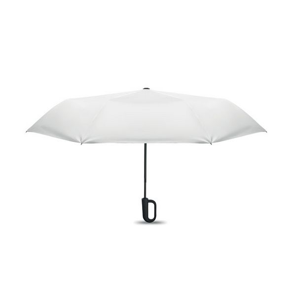 Sklopivi vjetrootporni kišobran od 21 inča s potpuno crnim okvirom od stakloplastike s 2 dijela. Rebra od stakloplastike. Paneli od 190T RPET svile. Ručka s karabinerom u obliku slova D s gumenom završnom obradom. Automatsko otvaranje i zatvaranje. Uključuje torbicu.