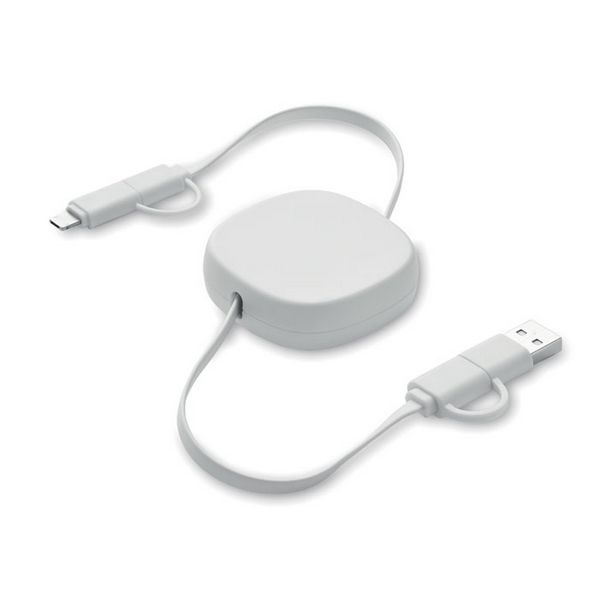 Uvlačivi kabel od 60 W u kućištu od reciklirane ABS plastike. Ulaz: 2-u-1 Type-C i Type-A. Izlaz: Type-C i micro-B (2 u 1 pin). Duljina kabela: 80 cm.