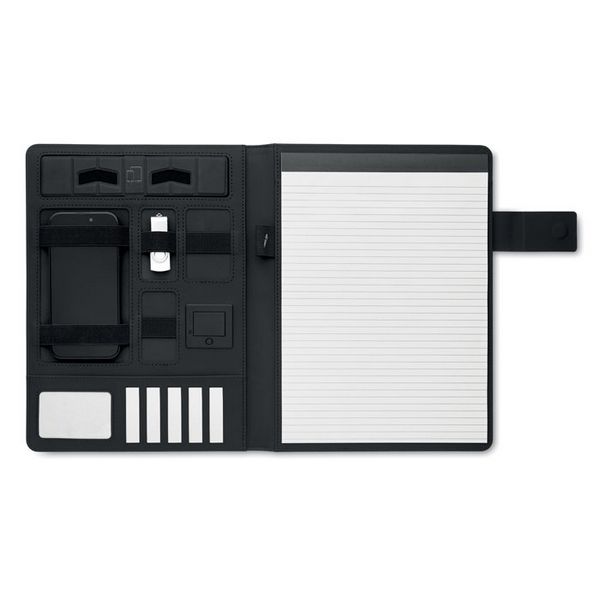 Konferencijska mapa A4 formata s lanenim PU omotom. Powerbank od 5000 mAh i magnetski bežični punjač od 15 W. Blok s 20 liniranih listova. Više unutarnjih pretinaca. Magnetsko zatvaranje. Elastični držač za olovke.