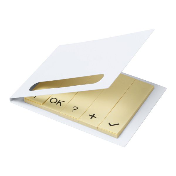 Paper covered adhesive notepad, including 100 adhesive notes with 5 different icons.