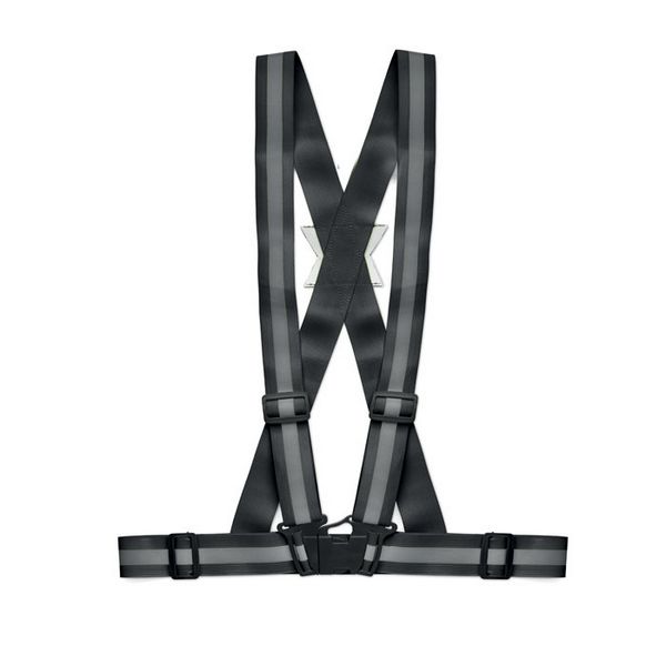 Podesivi reflektirajući pojas za tijelo od 360° sa srebrnim prugama. Samo za promotivnu upotrebu.