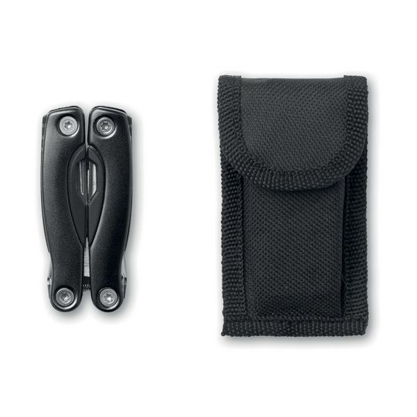 Sklopivi višenamjenski alat od nehrđajućeg čelika s kliještima od nehrđajućeg čelika. 9 funkcija alata. Uključena torbica od 600D poliestera.