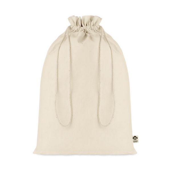 Velika poklon-vreća s vezicom od organskog pamuka. Veličina cca 30 x 47 cm. 105 gr/m².