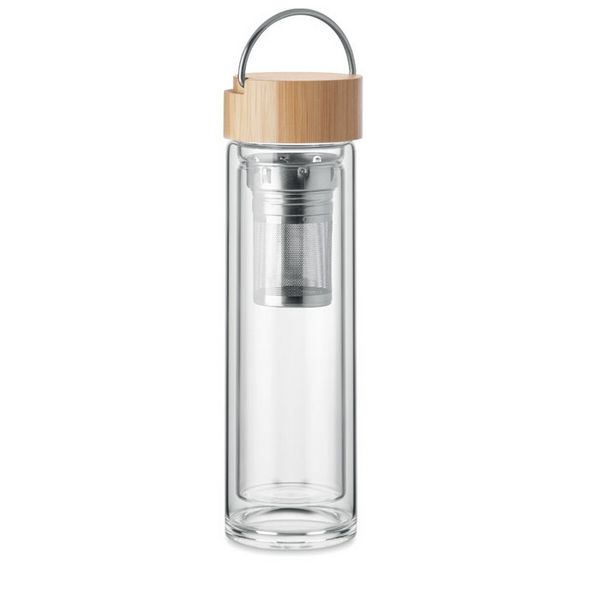 Boca s dvostrukom stijenkom od visokokvalitetnog borosilikatnog stakla i poklopcem od bambusa s vješalicom za čaj. Kapacitet: 400 ml. Bambus je prirodni proizvod, moguće su male varijacije u boji i veličini po artiklu, što može utjecati na konačni rezultat ukrašavanja.