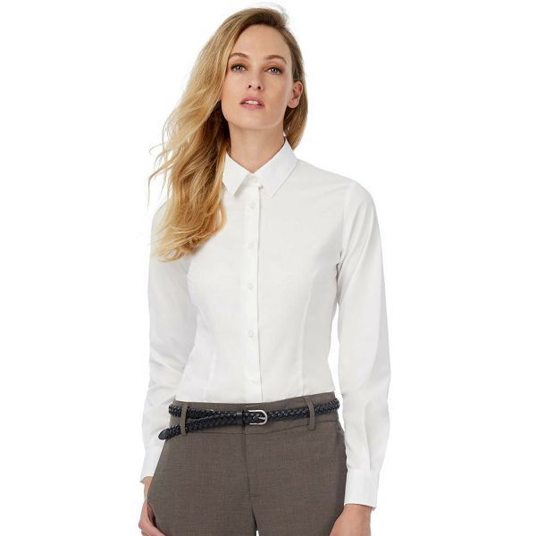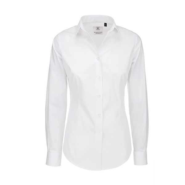 Mekani spojeni ženski ovratnik, četvrtasti, 2 gumba podesive manšete s dodatnim rupicama za manšete, zaobljeni porub, odgovarajući sedefasti gumbi našiveni u križ, vodoravna zadnja rupica, 1 rezervni gumb, strelice na prsima, sprijeda i straga, Materijal:
