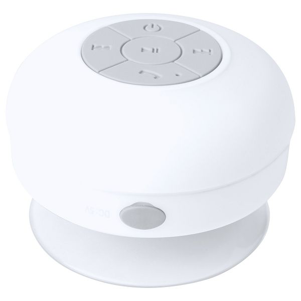 Splashproof (IPX4 protection) bluetooth speaker with rubber-coated housing and large suction cup. With hands-free call function and built-in rechargeable battery. Including USB charger cable.
