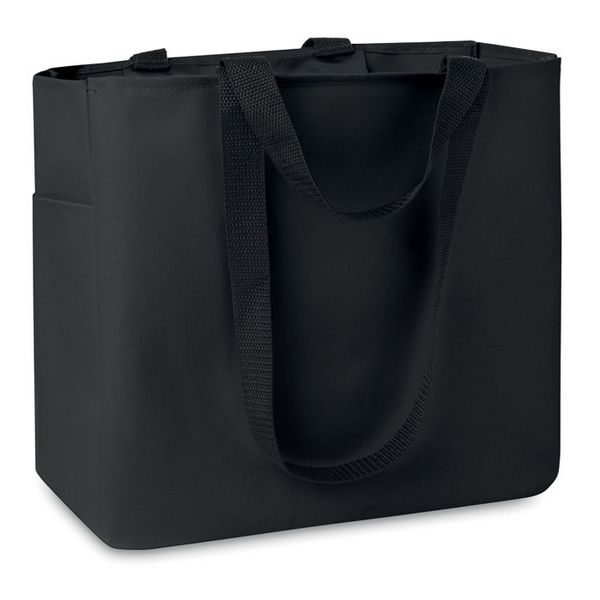 Torba za kupovinu od 600D poliestera s bočnim džepom i unutarnjim džepom s patentnim zatvaračem. Duge i kratke ručke.