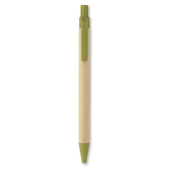 Kemijska olovka s gumbom, kućištem od recikliranog papira i PLA dijelovima (od 100% biorazgradivog kukuruza). Plava tinta.