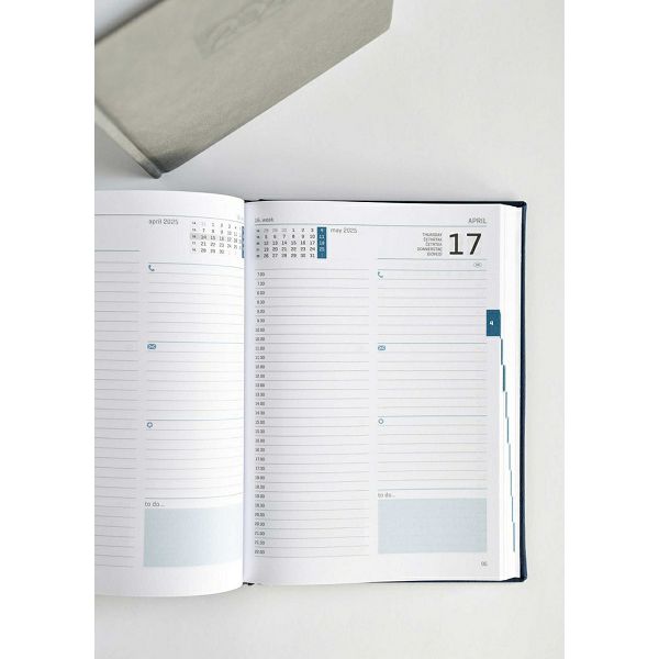 Opis proizvoda:320 strana \nPrvi dio sadrži osnovne podatke, godišnji planer za 2025, drugi dio sadrži planer na 314 strana, treci dio sadrži godišnji planer za 2026\ndimenzija: 16,5 x 22,5 cm \njezici: HR, GB\nvrsta papira: 80 g/m2 listovi\ntisak: dvije boje (siva, plava) \nuvez: tvrdi uvez - šivani, pokazna vrpca\npreporucena vrsta tiska: sitotisak, suhi žig, foliotisak, termotisak, UV tisak