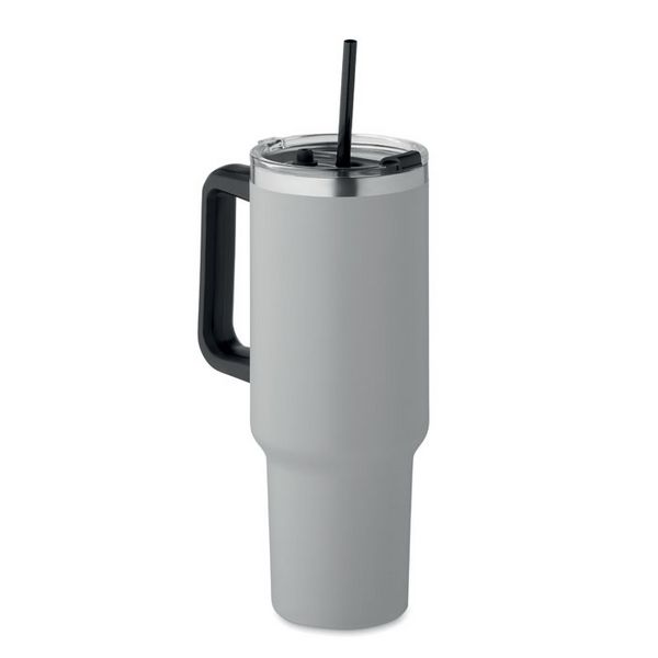 Dvoslojna čaša od recikliranog nehrđajućeg čelika (90% recikliranog nehrđajućeg čelika i 10% nehrđajućeg čelika) s poklopcem od slamke, uključujući PE slamku. Kapacitet 1200 ml.