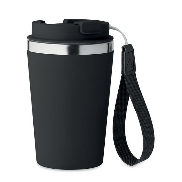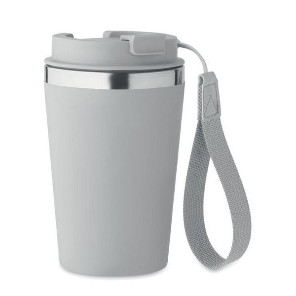Dvoslojna čaša od recikliranog nehrđajućeg čelika (90% recikliranog nehrđajućeg čelika i 10% nehrđajućeg čelika) s vanjskim slojem od PP-a i RPET remenom za zglob. Kapacitet: 350 ml.