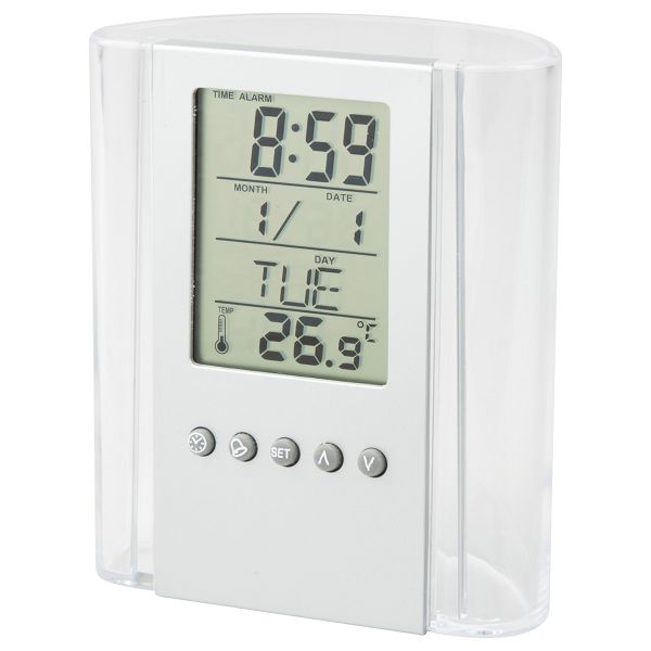 Transparent, plastic pen holder with digital display, thermometer, clock, alarm and calendar functions. Delivered with button cell battery.Veličina proizvoda: