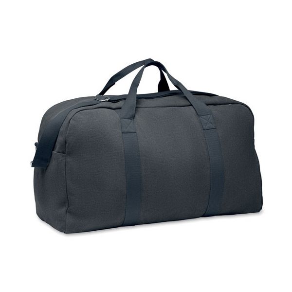 Putna torba od reciklirane tkanine od 450 gr/m² (60% recikliranog pamuka i 40% recikliranog poliestera) s podesivim i odvojivim pamučnim remenom.