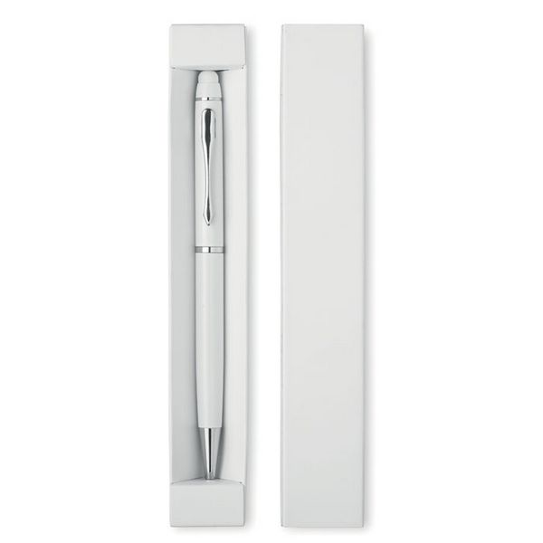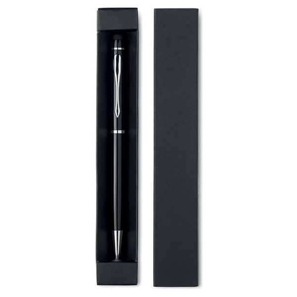 Kemijska olovka s okretnim mehanizmom i aluminijskom olovkom. Plava tinta. Dolazi u papirnatoj kutiji.