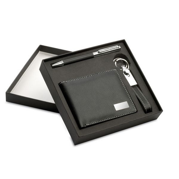 Elegantni poklon set na EVA pladnju i kartonskoj kutiji. Uključuje kemijsku olovku s plavim punjenjem, metalni privjesak za ključeve s PU petljom i PU novčanik. Potpuno PU završna obrada s kontrastnim šavovima.