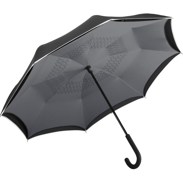 12mm drška od crnog galvaniziranog čelika, crna soft touch crook ručka s mogućnošću oglašavanja, rebra od stakloplastike, sigurnosni klizač s integriranim gumbom, ručno otvaranje, vrhovi od crnog nikla, obrnuti mehanizam za otvaranje i zatvaranje (kada je kišobran zatvoren, mokri sloj je unutra Materijal: