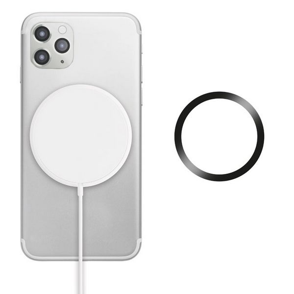 Magnetski bežični punjač od ABS-a. Izlaz: DC 9V/1,1A (10W) za brzo punjenje. Uključuje dodatni magnetski metalni prsten za podršku punjenja drugih nemagnetskih bežičnih telefona s mogućnošću punjenja.