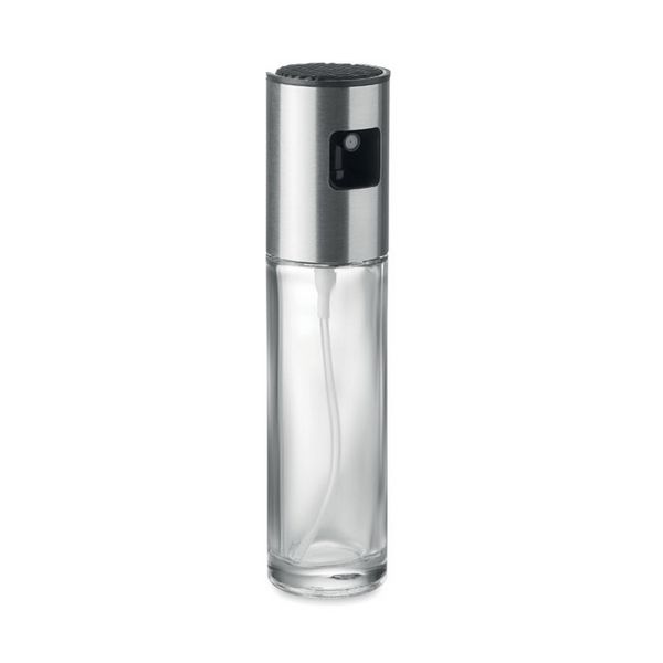 Stakleni dozator ulja s raspršivačem i poklopcem od nehrđajućeg čelika. Kapacitet: 100 ml.