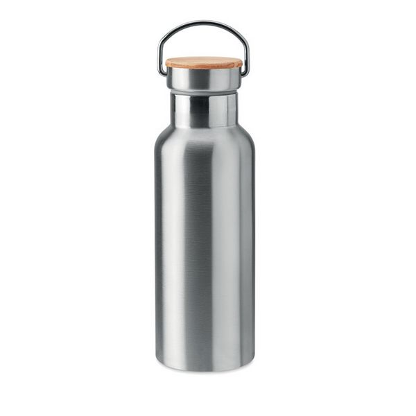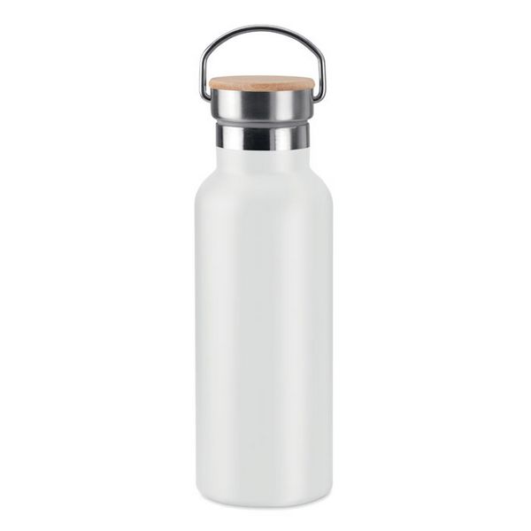 Dvoslojna termosica od nehrđajućeg čelika s poklopcem od bambusa i ručkom za nošenje. Kapacitet: 500 ml. Sublimacijski tisak dostupan je samo na bijelom artiklu. Ne propušta. Bambus je prirodni proizvod, moguće su male varijacije u boji i veličini po artiklu, što može utjecati na konačni rezultat dekoracije.