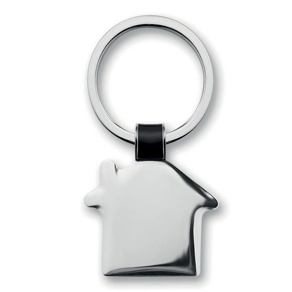 Metalni privjesak za ključeve u obliku kuće, sjajni niklani završetak.