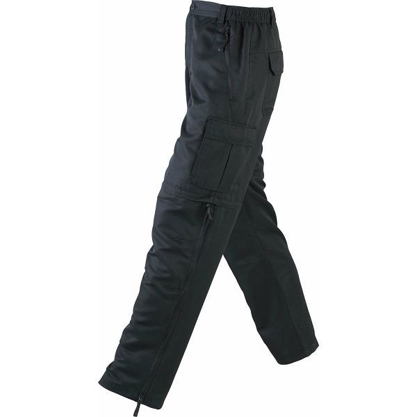 Otporan na vodu i prljavštinu, pojas sa strane s elastičnim umetcima, potkoljenice koje se mogu skinuti na patentni zatvarač, patentni zatvarač na nogavici (olakšava obuvanje i izuvanje u cipelama), 2 stražnja džepa, 2 bočna džepa s patentnim zatvaračem, 2 velika Materijal: