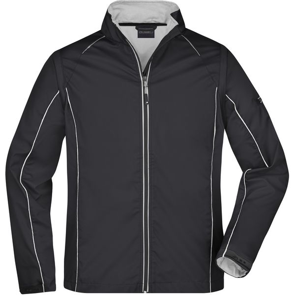 Otporan na vjetar i vodu (5000 mm vodenog stupca) Troslojna funkcionalna tkanina s TPU-membranom, prozračna, stojeći ovratnik, 1 unutarnji džep, 2 bočna džepa, džep na rukavima, šavovi nisu zapečaćeni, kontrastni obrub, kontrastna unutarnja strana, reflektirajući patentni zatvarač Materijal: