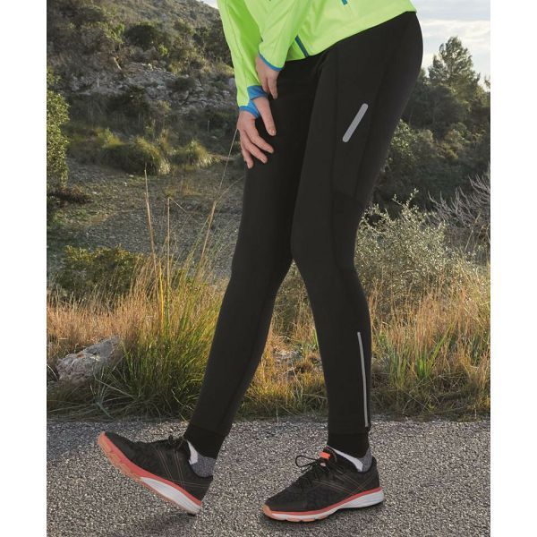 Prozračan, pojas s uzicom za zatezanje iznutra, mali džep za ključeve s patentnim zatvaračem, ravni šavovi s niskim trenjem, ugodna topla i vrlo elastična kvaliteta, hrapava iznutra, regulira vlagu, brzo se suši, krajevi nogavica s patentnim zatvaračem i reflektirajućim obrubom (bez zaštitne funkcije), dvostruko Materijal: