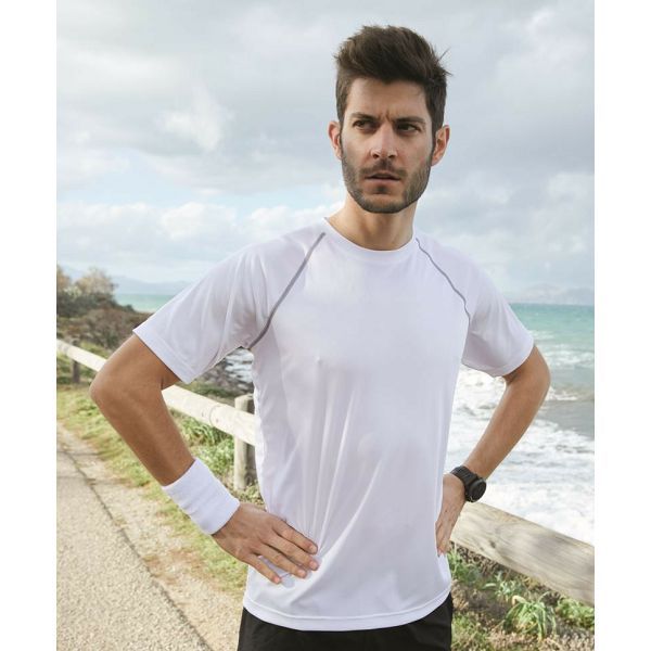 Prozračan, okrugli izrez, raglan rukavi, kontrastni ravni šavovi sprijeda i straga, regulacija vlage, brzo sušenjeMaterijal: