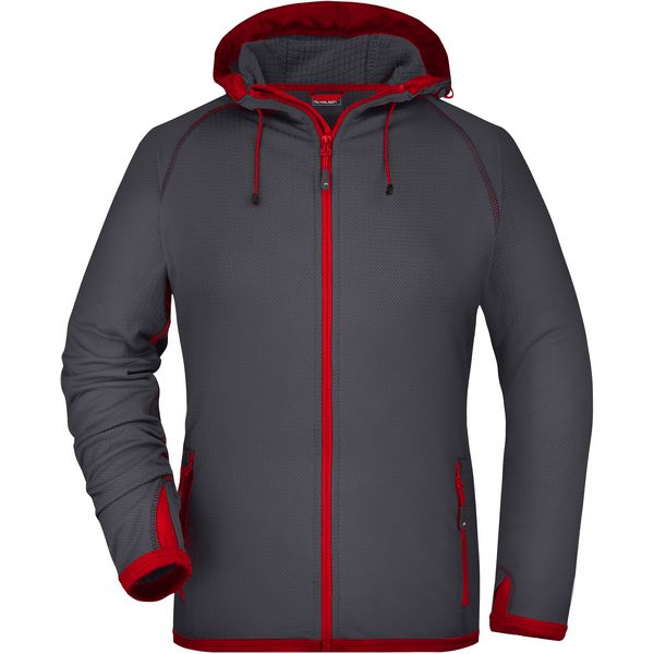 Usko skrojen model, glatka izvana sa suptilnim printom po cijeloj površini, iznutra: hrapavi flis u dijamantnom izgledu, kapuljača s elastičnom uzicom i čepom, podstavljeni patentni zatvarač po cijeloj dužini sa štitnikom za bradu, 2 bočna džepaMaterijal: