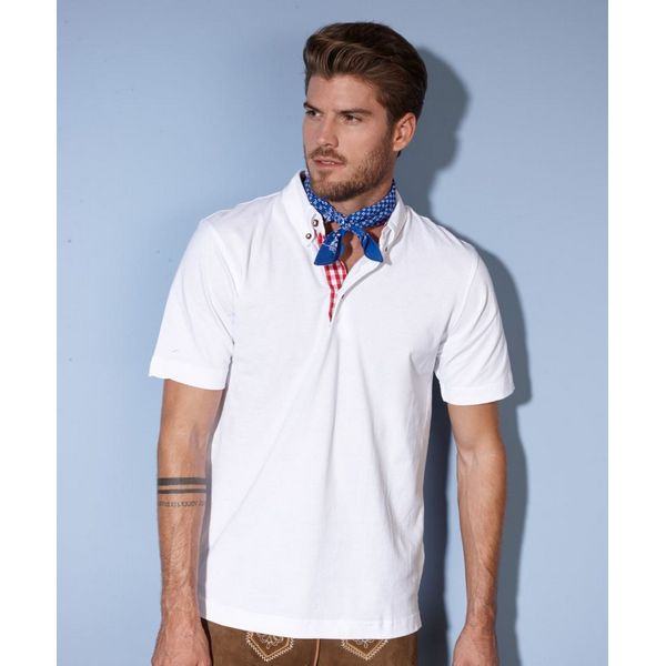 Polo u izgledu tradicionalne nošnje, ovratnik s kopčanjem, karirani uzorak na traci ovratnika, unutarnja kopča s gumbima i prorezi sa strane, 3 gumba za nošnju od umjetnog roga, polumjesec u tonu na leđima