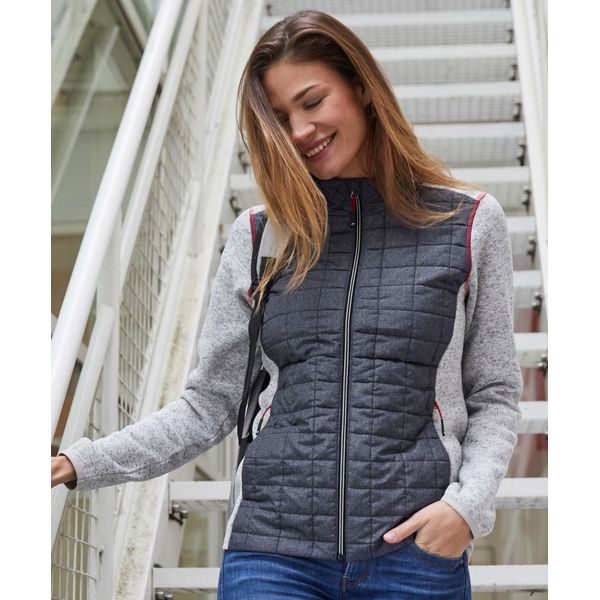 Usko krojen model, podstavljeni patentni zatvarač po cijeloj dužini, 2 bočna džepa s patentnim zatvaračem, 2 unutarnja džepa, kontrastni ravni šavovi na rukavima, prednjici, leđima i ovratniku u prošivenom kariranom dizajnu, melanž izgled, jednostavno održavanjeMaterijal: