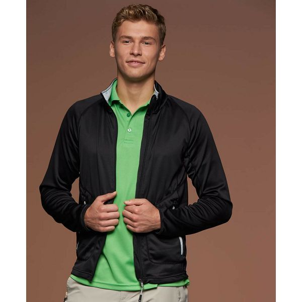 Usko krojen model, prozračan, samostojeći ovratnik, otvori za palac, podstavljeni patentni zatvarač sa štitnikom za bradu, 2 bočna džepa s patentnim zatvaračem, ravni šavovi, dvoelastična, glatka površina, hrapava iznutra