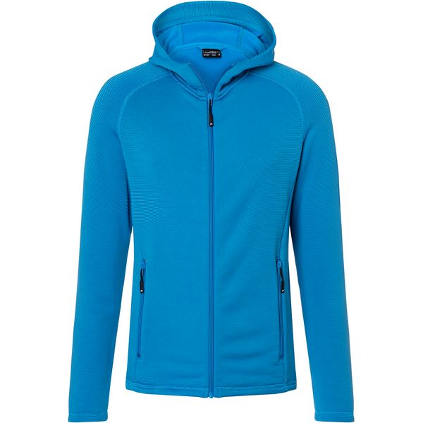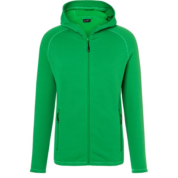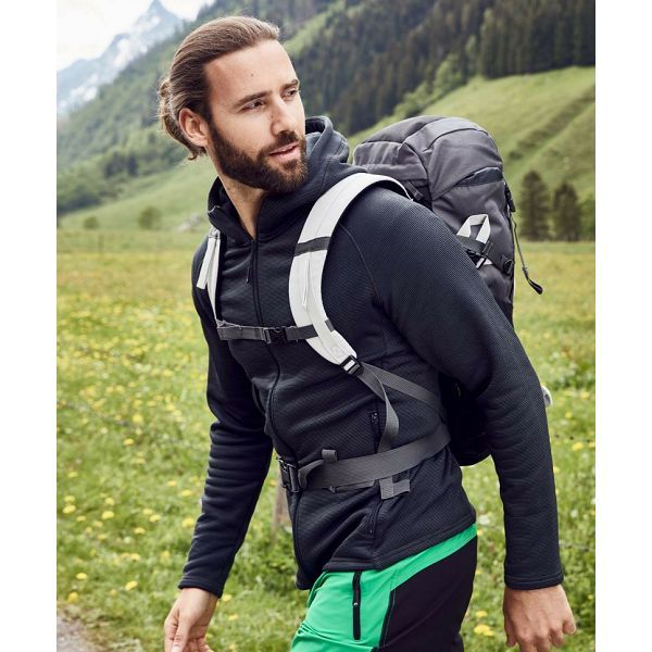 Urezana kapuljača, raglan rukavi, YKK patentni zatvarači, 2 bočna džepa s patentnim zatvaračem, ravni šavovi u tonu u tonu, iznutra hrapavi, izvana glatki u diskretnom prugastom izgledu