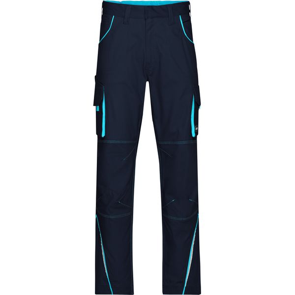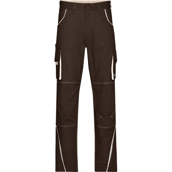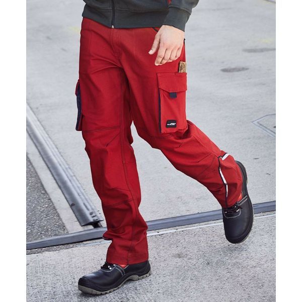 Ergonomsko pristajanje zahvaljujući udjelu elastina, elastični pojas s omčama za remen, skriveni gumbi i patentni zatvarači, džepovi na uvlačenje, nekoliko džepova za alat, džep za ravnalo, džep za mobilni telefon i džep za olovke, otporan na paranje šav u tri smjera, kvaliteta elastičnog laganog platna, reflektirajuća Materijal: