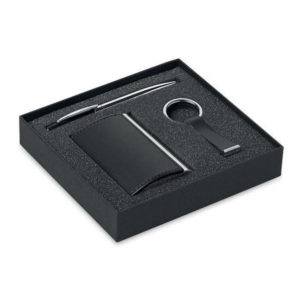 Poslovni poklon set uključuje metalnu kemijsku olovku s okretnim mehanizmom, od legure cinka s PU privjeskom za ključeve i držačem za kartice. Dostavljeno u kutiji. Crna tinta.
