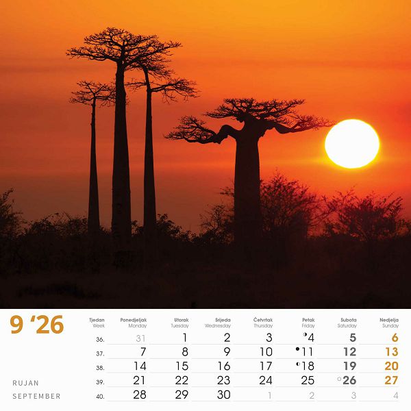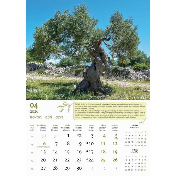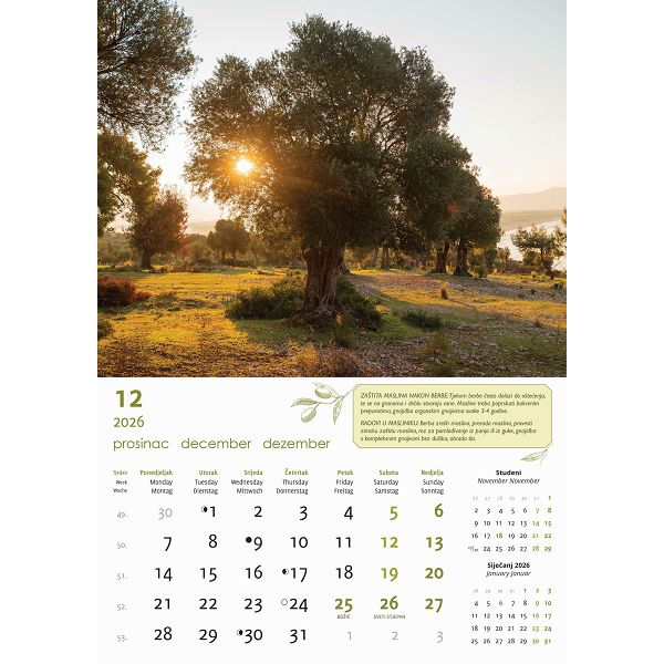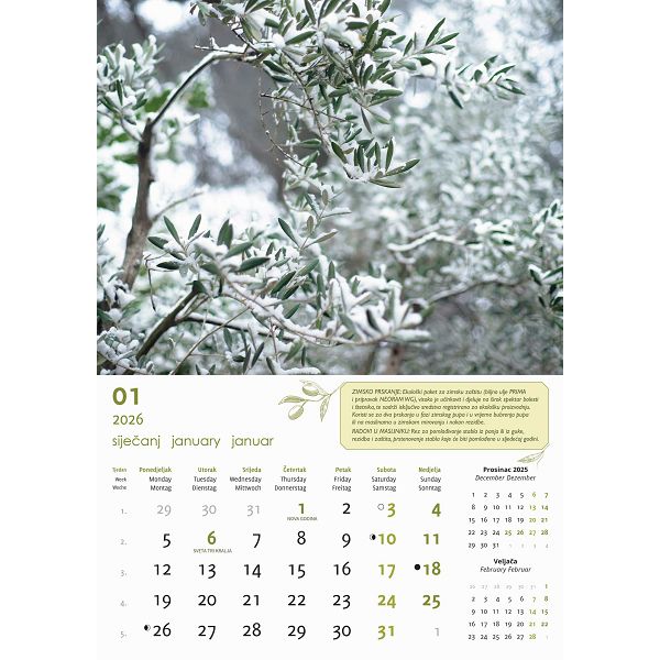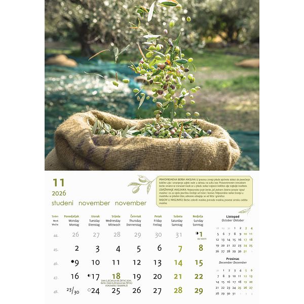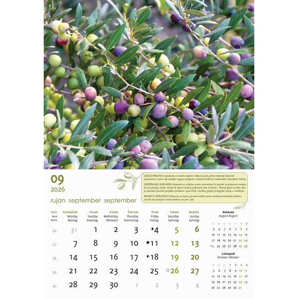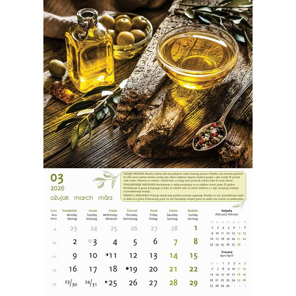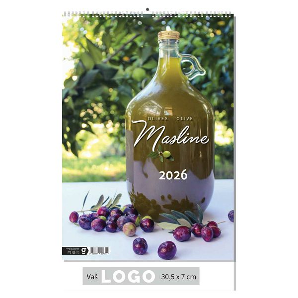 Opis proizvoda:13 listova\ndimenzija: 33,5 x 31 cm\nprostor za dotisak: 34 x 7 cm \nopis: jednomjesecni kalendarij, vrecica\njezici: HR, GB, DE, IT\nvrsta papira: KD 135 g/m2 listovi, 350 g/m2 podloga \nuvez: spiralni\npakiranje: 50 kom