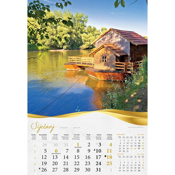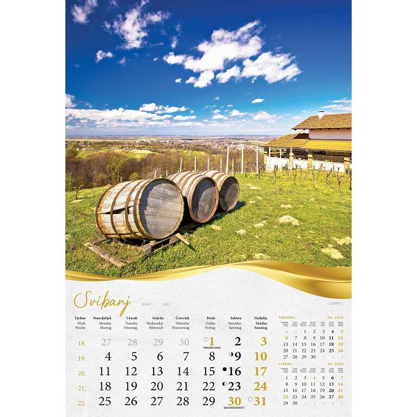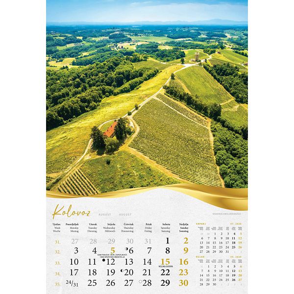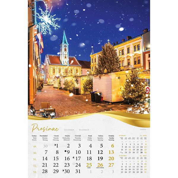 Opis proizvoda:13 listova\ndimenzija: 33 x 55 cm\nprostor za dotisak: 33 x 7 cm\nopis: tromjesecni kalendarij,vrecica\njezici: HR, GB, DE\nvrsta papira: KD 150 g/m2 listovi, 350 g/m2 podloga\nuvez: spiralni\npakiranje: 40 kom