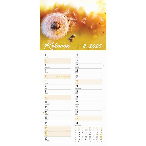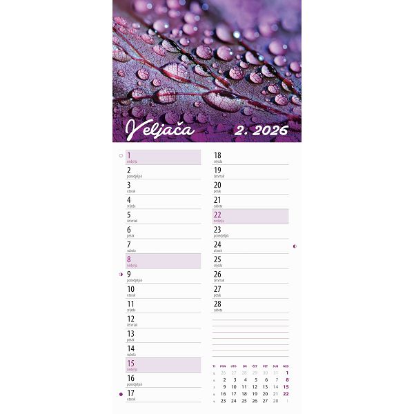 Opis proizvoda:13 listova\ndimenzija: 22 x 55 cm\nprostor za dotisak: 22 x 7 cm\nopis: jednomjesecni kalendarij, vrecica\njezici: HR\nvrsta papira: KD 135 g/m2 listovi, 350 g/m2 podloga\nuvez: spiralni\npakiranje: 60 kom