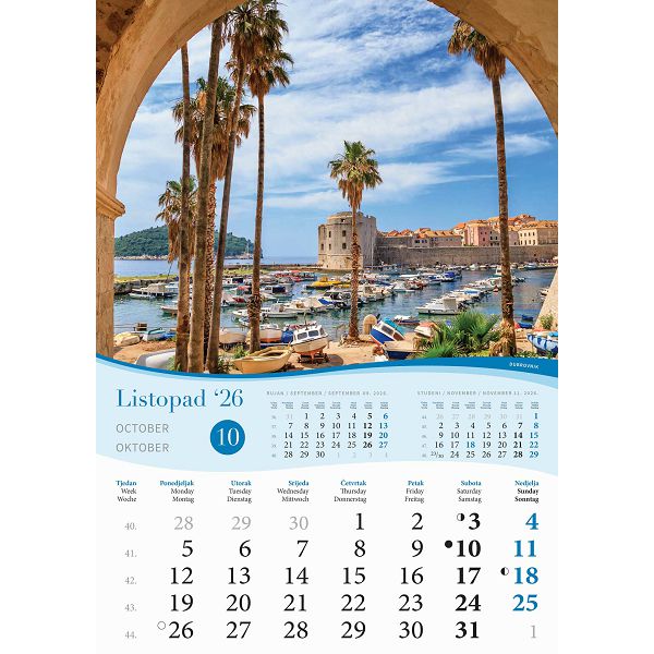 Opis proizvoda:13 listova\ndimenzija: 30,5 x 50 cm \nprostor za dotisak: 30,5 x 7 cm\nopis: tromjesecni kalendarij,vrecica\jezici: HR, GB, IT\nvrsta papira: KD 135 g/m2 listovi, 350 g/m2 podloga \nuvez: spiralni\npakiranje: 50 kom