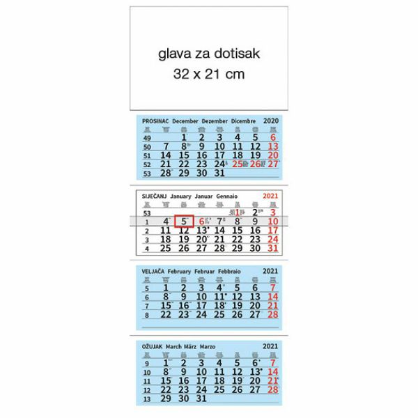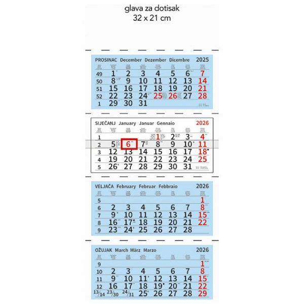 dimenzija: 31,5x59 cm; glava za dotisak: 31,5x21 cm; 4 bloka; preklopni; traka sa kliznim pokazivacem; obilježeni medunarodni praznici