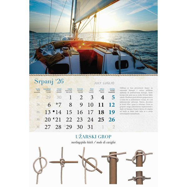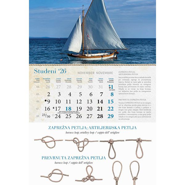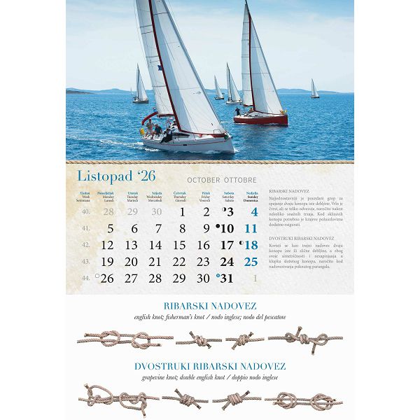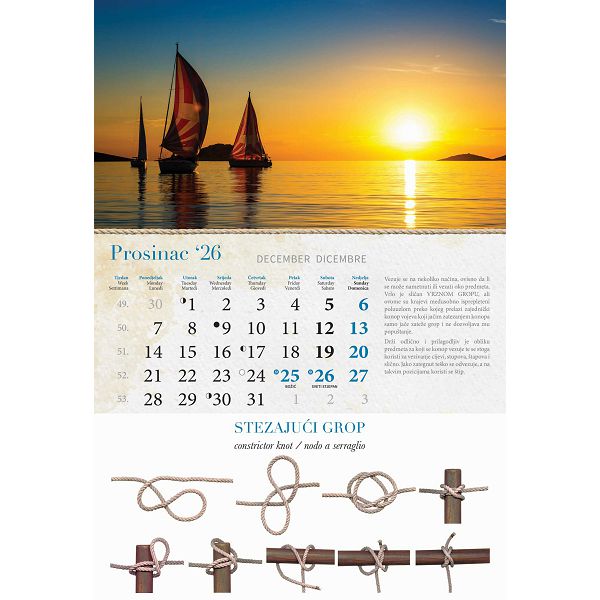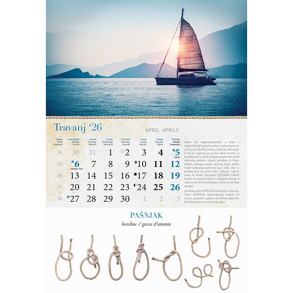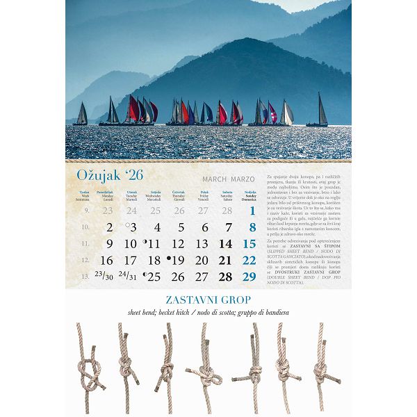 Opis proizvoda:13 listova\ndimenzija: 33 x 55 cm\nprostor za dotisak: 33 x 7 cm\nopis: tromjesecni kalendarij,vrecica\njezici: HR, SI, GB\nvrsta papira: KD 150 g/m2 listovi, 350 g/m2 podloga\nuvez: spiralni\npakiranje: 40 kom