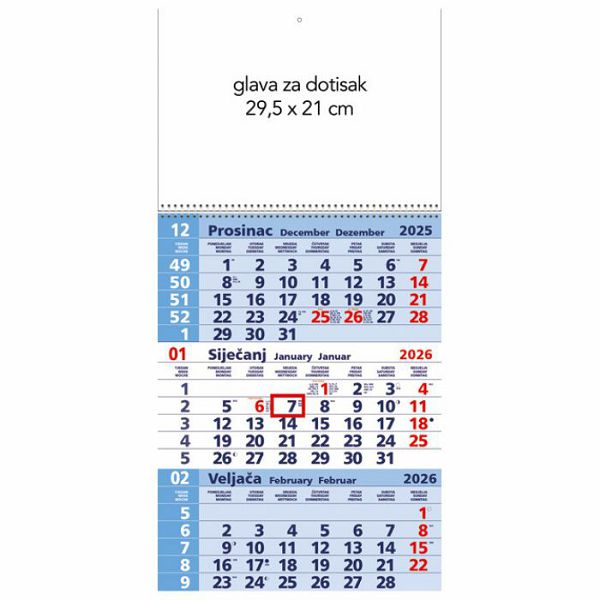 KALENDAR ZIDNI TRODIJELNI 2026. SA SPIRALOM PLAVI