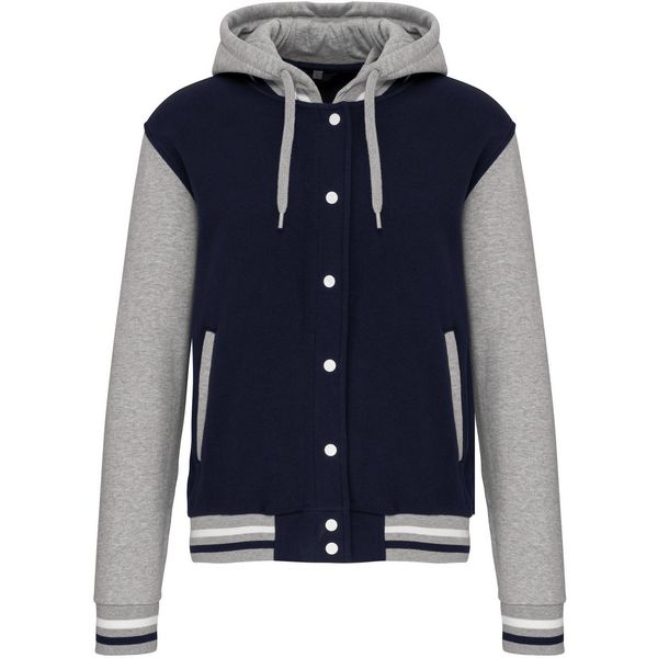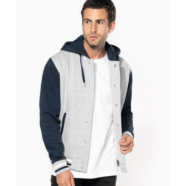 Kapuljača od 3 dijela s podstavom od žerseja, užetom u kontrastnoj boji, trakom od kepera, kopčanjem na gumbe, 2 bočna džepa s obrubom u kontrastnoj boji, rebrastim pletenim ovratnikom, rukavima i manžetama s kontrastnim prugama, omčom za vješanje, etiketom neutralne veličineMaterijal: