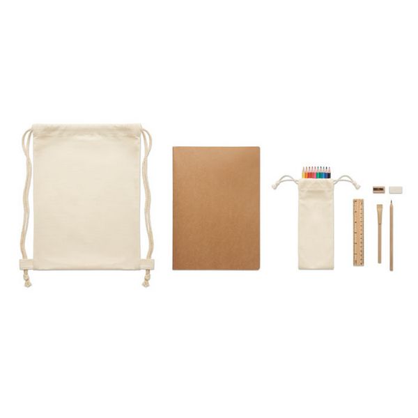 Dječji set za crtanje i pribor za pisanje od 5 dijelova, uključujući drveno ravnalo, drveno šiljilo, gumicu, drvenu olovku i kartonsku kemijsku olovku. Dodatnih 10 bojica, reciklirani papir A4 formata, 50 običnih listova (100 stranica). Dostavlja se u pamučnoj vrećici sa vezicom.