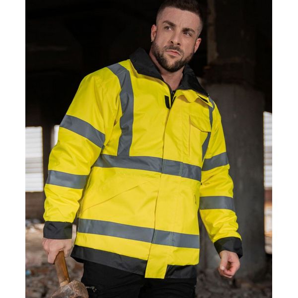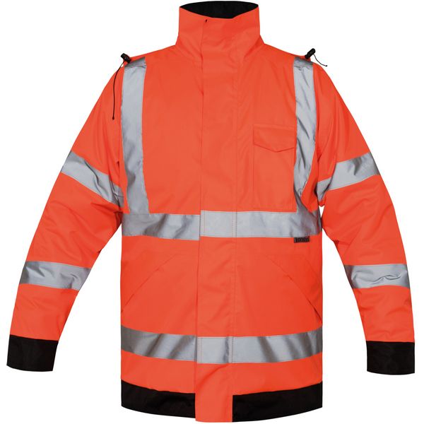 Kapuljača u ovratniku, unutarnje manšete, patentni zatvarač s preklopom za vjetar po cijeloj dužini, 2 skrivena džepa s bočnim ulazom i patentnim zatvaračem, džep na prsima s kopčom na čičak, ukrasni pristup u podstavi, narančasta također odgovara GO/RT 3279, certificirana prema klasi EN ISO 20471 Materijal:
