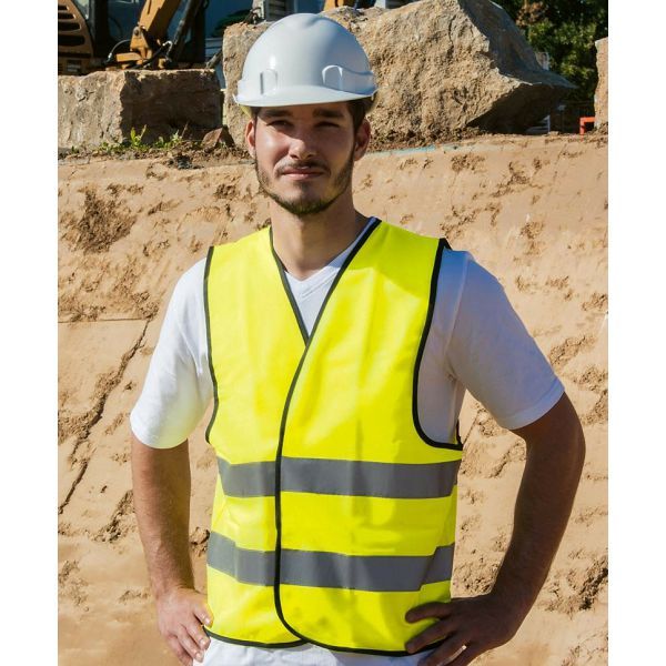 Podstavljen crnim poliesterskim rubom, podesive veličine s 2 čičak kopče, certificirano prema EN ISO 20471, neonsko ružičasto i neonsko zeleno EN 17353 tip AB3 (dnevno svjetlo i tama) certificirano, dvije reflektirajuće trake širine 5 cmMaterijal: