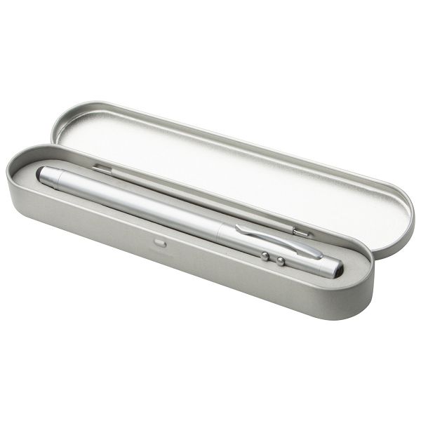 Multifunctional laser pointer with ballpoint and touch screen pen and LED light. In metal gift box with button cell batteries and blue refill.Veličina proizvoda: