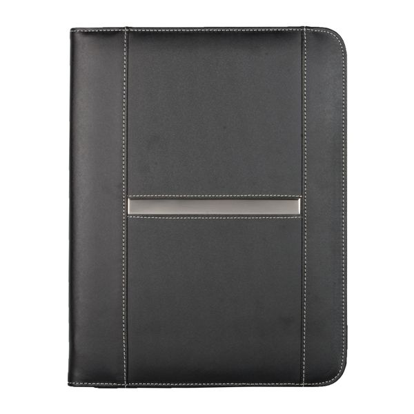 Leather, zipped document folder with metal inlay on cover. With lined sheet notepad, business card and pen holder.Veličina proizvoda: